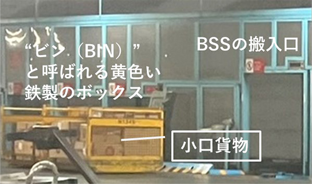 さて、小口貨物を入れた黄色い鉄製の“ビン(BIN)”はそのままBSSに格納されます。BSSに格納された貨物は3階および4階の作業エリアに垂直搬送されて、航空コンテナなどに積載されることになります。