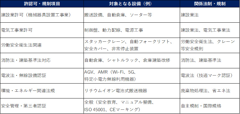 特に物流機器の導入には、建築基準や労働安全衛生法への適合を前提として、日本市場での施工・保守体制についても対応状況を確認していく必要があります。例えば、日本進出している中国メーカーにおいては、機械器具設置工事業の許可を日本法人として取得している場合もありますし、日本の代理店を元請として導入施工を行う場合も多くあります。下記に物流センターで自動化設備を導入するにあたって確認すべき関連する許認可や規制を例示します。