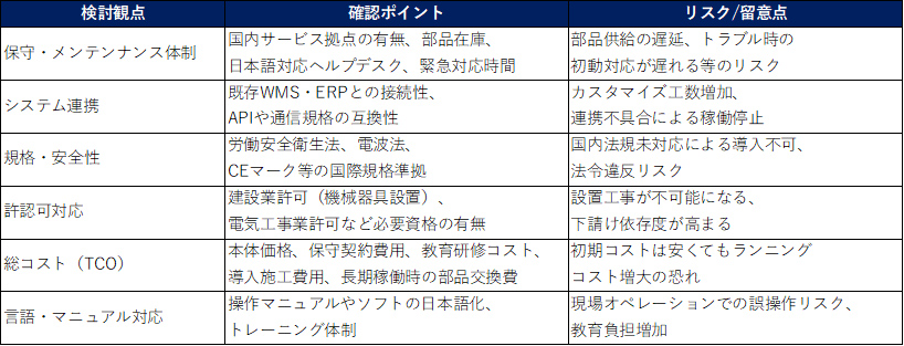 図表:3 海外メーカーの物流機器を導入する際に検討すべき事項