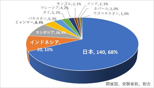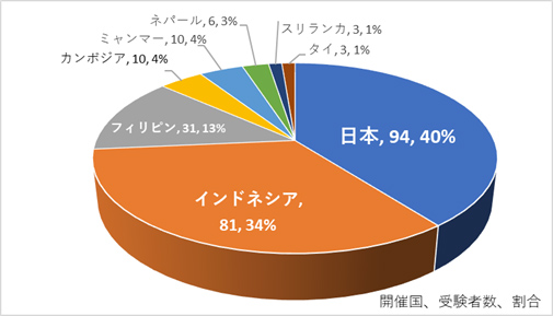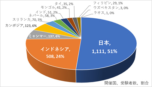 これまでに12か国で実施されており、内訳をみると、「日本」国内での受験者数が最も多く、1,111人(51%)と5割以上を占めています。次いで、「インドネシア」508人(24%)、「ミャンマー」137人(6%)、「カンボジア」123人(6%)と続いています。