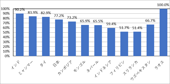 「インド」が最も合格率が高く90.2%と9割を超えています。次いで、「ミャンマー」83.9%、「タイ」82.9%、「日本」77.2%、「カンボジア」73.2%と続いています。
