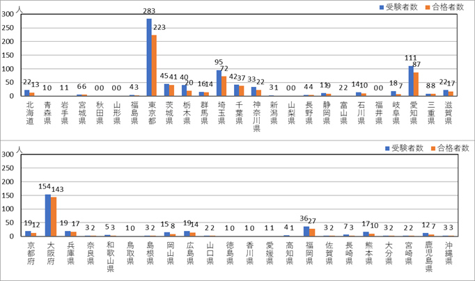 「日本」での実施状況は図1.4のとおりです。これまで「43都道府県で実施されています。受験者数と合格者数を県別にみると、「東京都」、「大阪府」、「愛知県」、「埼玉県」と首都圏に集中する傾向があります。