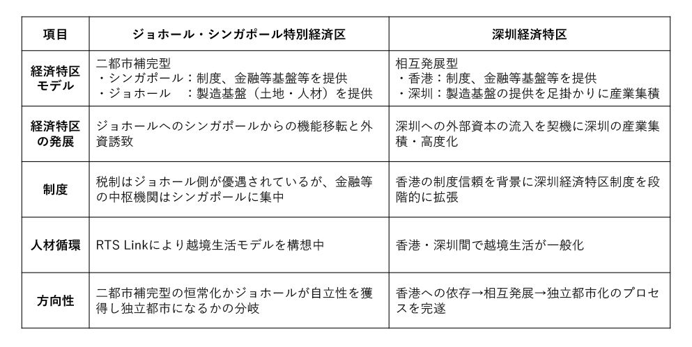 まず、両経済特区共に国境を跨いだ産業圏をつくる点で類似性があります(シンガポール×ジョホール、深圳×香港)。シンガポールとジョホールのそれぞれの役割は上述した通りで、お互いを補完し1つの都市のように経済圏を拡張していく関係にあります。一方で、深圳と香港は同じように都市機能を分担したものの、その関係は時間とともに変化しました。香港は国際金融センターとして資本市場や法制度の信頼性を提供し、深圳は製造業集積を軸に成長を始めました。しかし深圳は外資依存にとどまらず、自ら研究開発力を高め、EV、AIといった高度産業の発展を遂げました。結果として深圳は香港に依存する都市ではなく、単独で世界市場に挑む都市へと変わりました。両経済特区を以下の通り整理します。