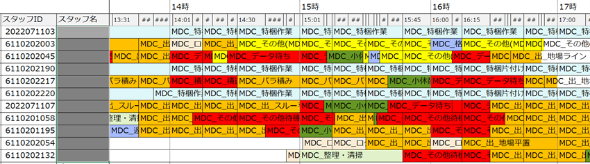 図1:スタッフ別タイムチャート(赤が待機時間)