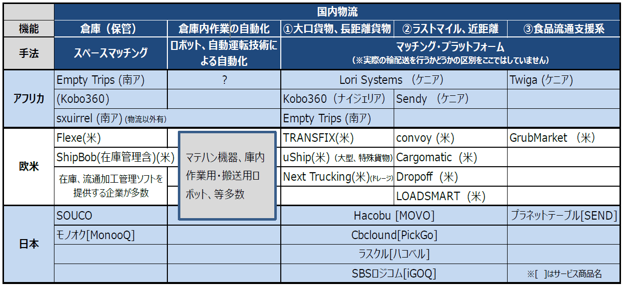 現在のところ輸配送以外の領域ではアフリカスタートアップ企業の活動は限定的なようです。アメリカや日本の物流ベンチャー、スタートアップ企業の動向とデスクトップベースの情報で比較してみました(下表)。